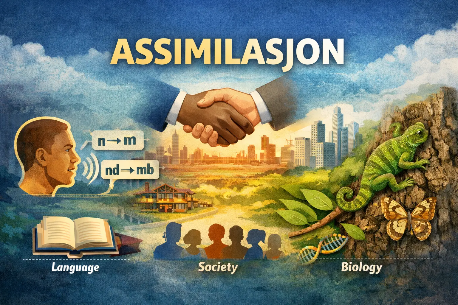 The common thread across these contexts is that assimilasjon involves adapting to become more similar or compatible with the surrounding environment, whether it’s sounds, social norms, or natural traits.